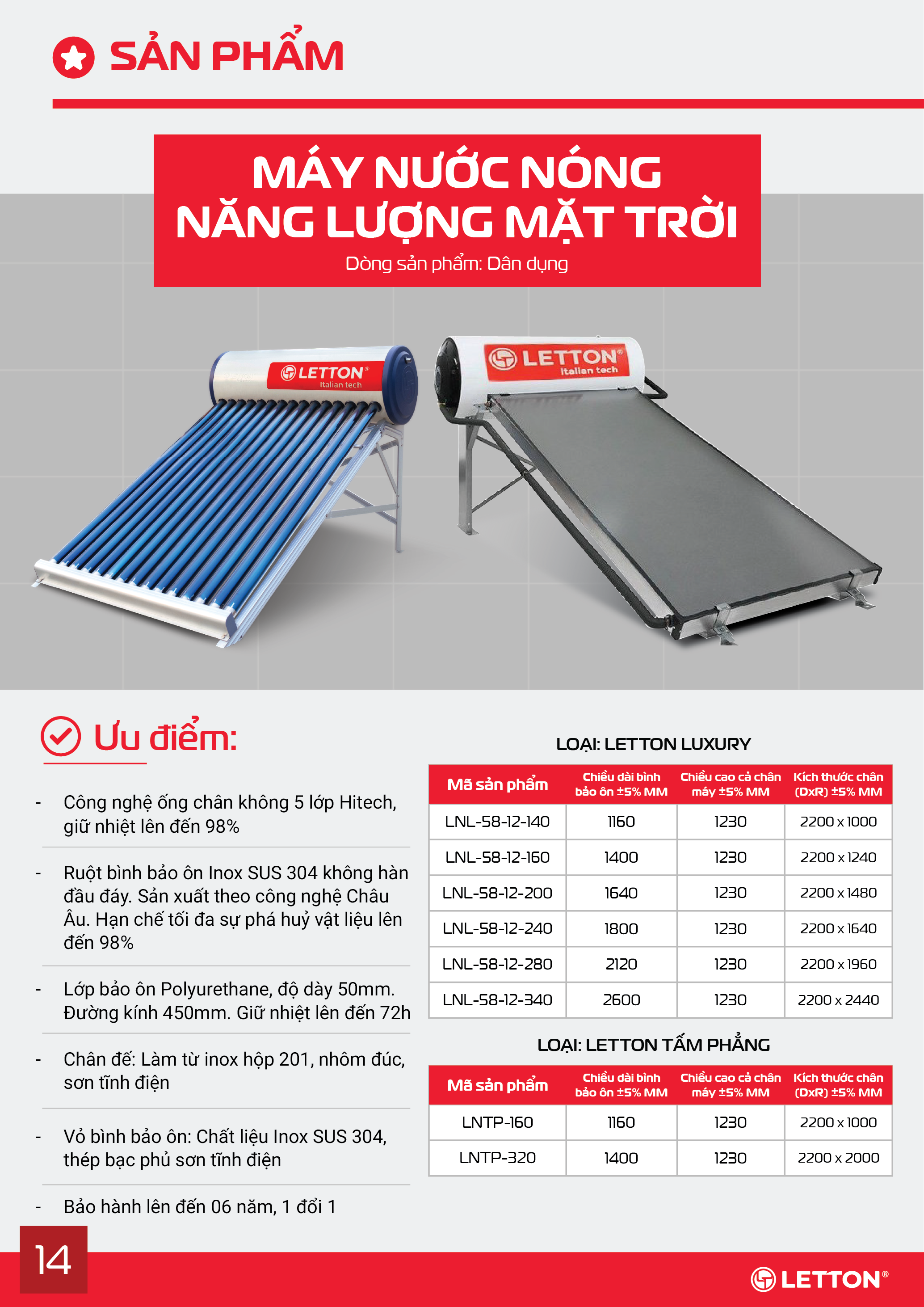 - Sản phẩm Letton được phát triển dựa trên công nghệ châu Âu tiên tiến, sử dụng ống thủy tinh chân không đa lớp và bồn chứa inox cao cấp, giúp hấp thụ nhiệt tối đa, giữ nhiệt lâu và tiết kiệm đến 80% điện năng.(Developed with advanced European technology, Letton systems feature multilayer vacuum glass tubes and high-grade stainless steel tanks for maximum heat absorption, long-lasting retention, and up to 80% energy savings)